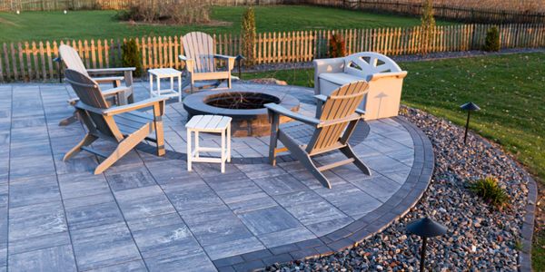 To create an additional gathering space, we installed a circular paver fire pit patio connected to the main patio by a 4-foot-wide walkway. The fire pit area features Discover pavers with a matching border and a 36-inch Summit Stone fire pit with a steel insert, providing the homeowners with a comfortable space for relaxing and entertaining.